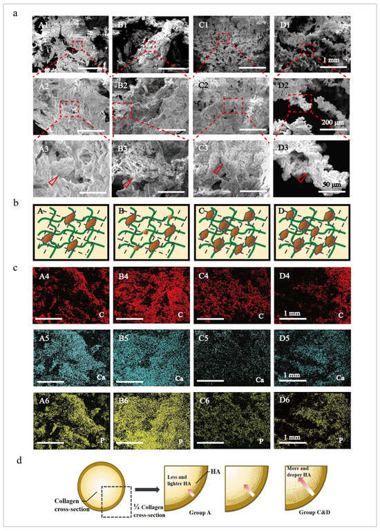 The morphologies of the mineralized collagen under different cross-linking conditions. (a) SEM images of the mineralized collagen at 1 mm, 200 μm, and 50 μm scales. A1–A3 are the images of Group A. B1–B3 are the images of Group B. C1–C3 are the images of Group C. D1–D3 are the images of Group D. Hydroxyapatite was found in all four groups. (A3–D3, triangles). (b) A schematic diagram of the mineralization process under different cross-linking conditions. Group A is mineralization after complete cross-linking. Group B is simultaneous cross-linked mineralization. Group C&D is simultaneous cross-linked mineralization after pre-cross-linking. (c) EDS images of mineralized collagen at 1 mm. C stands for carbon, Ca stands for calcium, and P stands for phosphorus. A4–A6 are the images of Group A. B4–B6 are the images of Group B. C4–C6 are the images of Group C. D4–D6 are the images of Group D. (d) A schematic diagram showing that the mineral mass of the dynamic cross-linking group was more deeply embedded in the mineralized collagen, while the mineral mass of the mineralized after cross-linking group was less and was more attached to the surface.