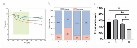 (a) The thermogravimetric curves of the mineralized collagen matrix. The yellow box I indicates a range of 100–180 °C, and the green box II indicates a range of 200–550 °C. (b) The mass fraction of each component of the composite mineralized collagen. (c) The enzymolysis rate of the mineralized collagen. * p < 0.05, ** p < 0.01.
