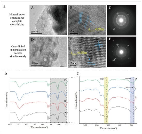 (a) TEM and SAED images of the cross-linked and then mineralized collagen and dynamic cross-linking of the mineralized collagen. (A–C) are the group of “Mineralization occurs after complete crosslinking”. (D–F) are the group of “Cross-linked mineralization occurs simultaneously”. (b) The FTIR of the mineralized collagen in each group. (c) The amplification of the gray area of (b) (500 cm−1–1500 cm−1).