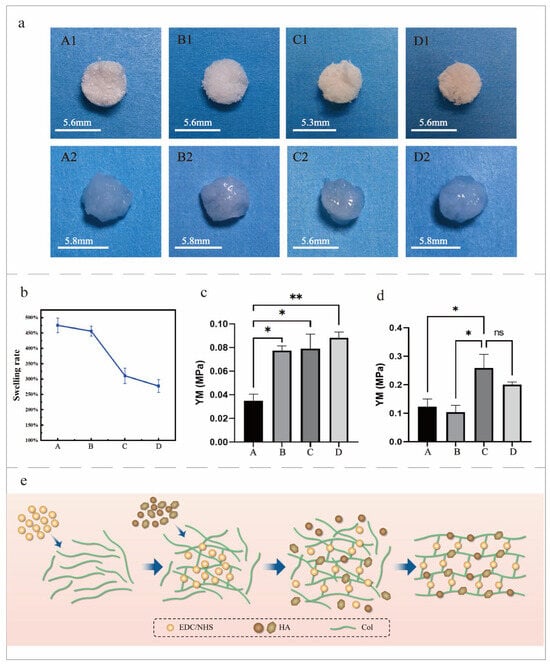 (a) Comparison of the mineralized collagen before and after swelling under different cross-linking conditions. (A1–D1) are the images before swelling, and (A2–D2) are the images after swelling. (A1–A2) are the images of Group A. (B1–B2) are the images of Group B. (C1–C2) are the images of Group C. (D1–D2) are the images of Group D. (b) The swelling rate of the mineralized collagen. (c) The Young’s modulus of the mineralized collagen. (d) The Young’s modulus of the mineralized collagen after swelling. (e) A schematic diagram of the dynamic-cross-linked mineralization after pre-cross-linking. * p < 0.05, ** p < 0.01, ns: no significant difference.