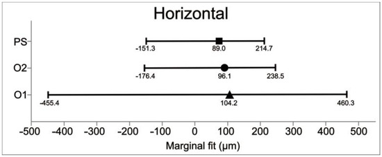 The mean vertical and horizontal fit values and scanning time for the experimental groups are presented in Table 3. The percentage categories for vertical fit are provided in Table 4. The mean vertical fit values (±SD) were: O1—46.7 ± 16.4 μm; O2—33.8 ± 21.4 μm; and PS—12.3 ± 6.6 μm. For horizontal fit, the mean values (±SD) were: O1—104.2 ± 20.1 μm; O2—96.1 ± 16.9 μm; and PS—89.9 ± 14.2 μm. Figure 3 and Figure 4 illustrate the mean fit values and their ranges for the vertical and horizontal assessments, respectively.