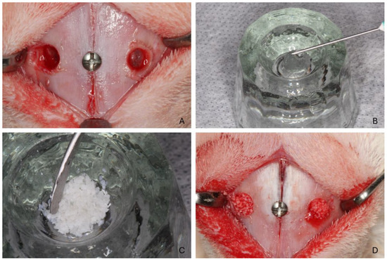 Clinical procedures. (A) Osteotomies were prepared laterally to the naso-incisal suture. A small screw was placed to mark the center of the osteotomies for subsequent histological analysis. (B) Regenfast was dispensed into a glass dappen dish; (C) Bio-Oss® granules were mixed with Regenfast; (D) After the elevation of the sinus mucosa, the grafts were inserted into the elevated space.