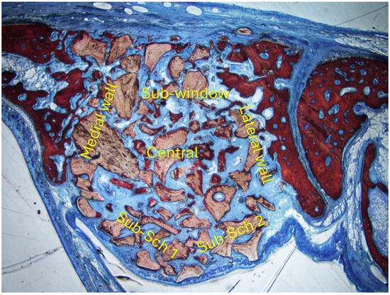 However, the granules of biomaterial used in this study once again demonstrated their excellent properties, particularly their ability to maintain the volume achieved following sinus augmentation over time and their conductivity, which facilitates the spread of new bone from the sinus walls towards the central and sub-Schneiderian regions. In the latter region, specifically, no new bone formation was observed after the initial 2-week healing period. The potential of the sinus mucosa to contribute to bone formation has been clearly demonstrated in several studies [52,53,54,55,56]; however, this potential has been questioned in in vivo situations [57]. Additionally, it has been shown that the structure of the pseudo-periosteum beneath the sinus mucosa is lost during the early stages of healing following sinus augmentation [58].