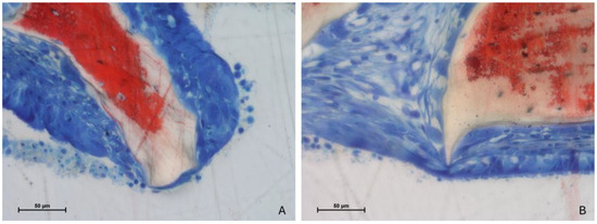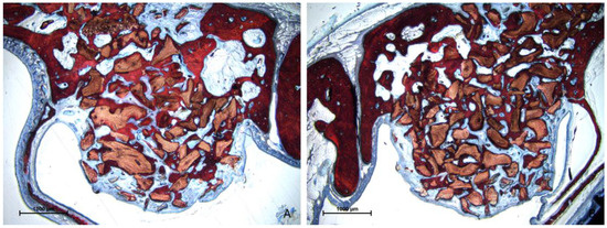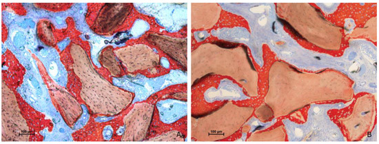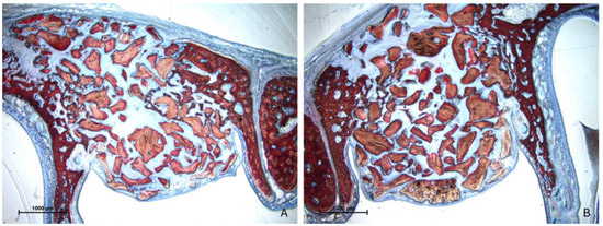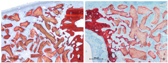 Photomicrographs of ground sections after 10 weeks of healing. The histological characteristics were comparable between the test and control groups. A notable increase in new bone formation was observed in all evaluated regions compared with the 2-week period. (A) test site (Regenfast mixed to Bio-Oss® granules); (B) control site (only Bio-Oss® granules). Stevenel’s blue and alizarin red stain.