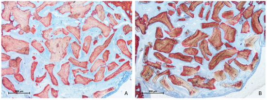 Photomicrographs of ground sections after 10 weeks of healing. Bone growth was observed extending along the granule surfaces, forming bridges between them and utilizing the osteoconductive potential of the biomaterial. (A) test site; (B) control site. Stevenel’s blue and alizarin red stain.