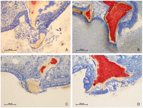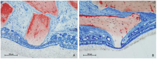Photomicrographs of ground sections after 2 weeks of healing. The regions near the center and the sub-Schneiderian area showed minimal new bone formation, with graft granules predominantly encapsulated by soft tissues. (A) test site; (B) control site. Stevenel’s blue and alizarin red stain.