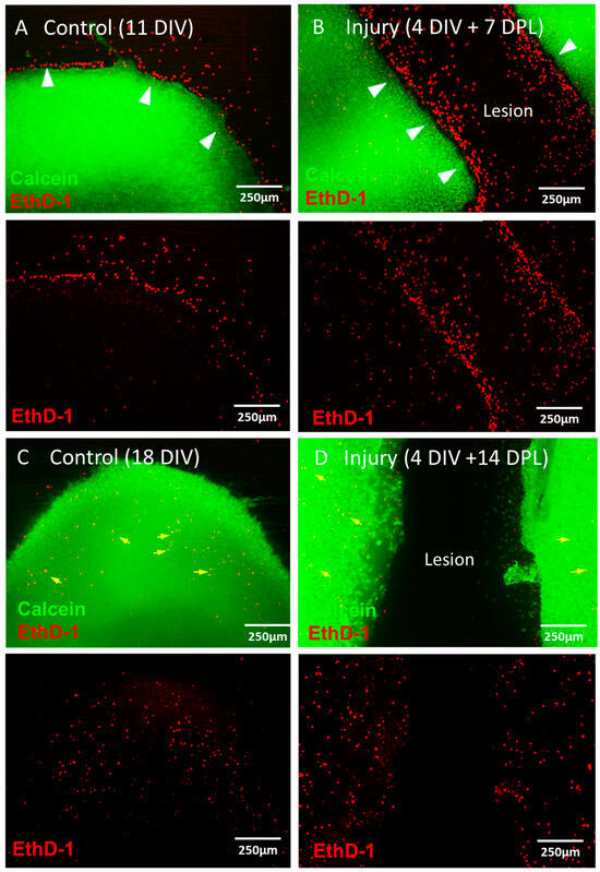 Viability of control and injured bOSCs. Representative micrographs of control, uninjured bOSCs at 11 DIV (A) 4 DIV + 7 DPL (B), 18 DIV (C) or 4 DIV + 14 PDL (D). Merged images are shown are for calcein (live cells) and EthD-1 (dead cells), with the corresponding EthD-1 only stain below the corresponding merged image. White arrows highlight dead cells localised to the slice edge of the lesion margins; yellow arrows indicate cell death within the body of the slice at later timepoints.