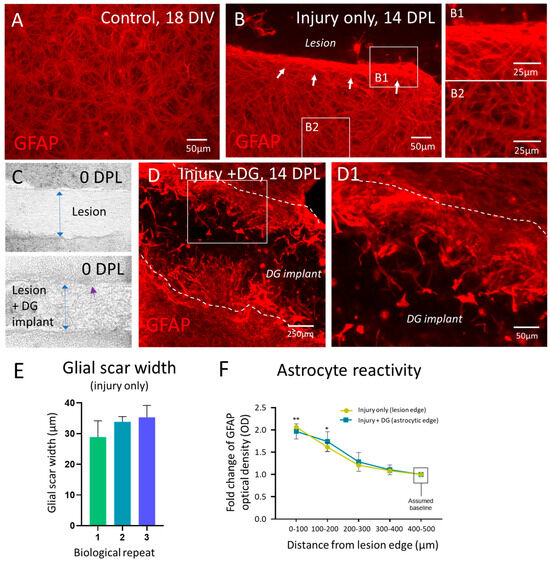 Astrocytes display enhanced GFAP reactivity at the injury site and biomaterial implantation at the lesion supports astrocytic ingrowth (14 DPL). (A) Representative micrograph of normal appearing morphologies in a dense syncytium of astrocytes distributed throughout the bOSCs at 18 DIV. (B) Representative micrograph of injury-induced astrogliosis at the lesion margin, including a band of intense GFAP expression and a glial-scar like interconnected network of astrocytes at 14 DPL (shown in higher magnification in (B1)). (B2) displays little or no astrogliosis in astrocytes distant from the lesion margins. White arrows indicate the band of increased GFAP staining. (C) Phase contrast images of the lesion area pre- and post-DG implantation (at 0 DPL) where the material can be observed filling the lesion cavity. Blue arrows identify the implanted biomaterial sheet. The purple arrow indicates the biomaterial-slice interface. (D) At 14 DPL, there was extensive astrocytic ingrowth into the DG implant, with an apparent disruption of the glial scar-like structure. Astrocytes in the material varied in levels of GFAP expression. The dashed line indicates the lesion margins. (D1) Magnified view of ((D), white box) displays that astrocytes at the biomaterial–slice interface show varying levels of GFAP expression and a range of cellular morphologies. (E) Bar graph presents the average glial scar width per biological repeat. There are no significant differences between data. Data are presented as mean ± SEM and analysed by a one-way ANOVA with Tukey’s multiple comparisons test, (n = 3). (F) Graph demonstrates a significant increase in GFAP expression (optical density measurements) at the lesion margins of injury-only slices compared to the baseline GFAP expression 400–500 µm from the lesion site. Injury + DG implantation showed no obvious enhancement or reduction in GFAP reactivity. Data are presented as mean ± SEM and analysed by a two-way ANOVA with Tukey’s multiple comparisons test, n = 4, asterisks indicate * p < 0.1, ** p < 0.01.