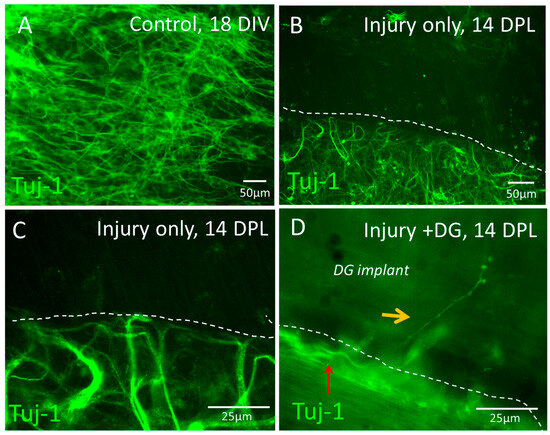 Limited axonal outgrowth observed with or without biomaterial implantation (14 DPL). (A) Representative micrograph of the neuronal network within control, uninjured slices (18 DIV). (B) Restricted axonal outgrowth was observed from the lesion margins in injury-only slices (14 DPL). (C) Higher magnification of (B) at the lesion edge confirms lack of axonal outgrowth. (D) DG implantation shows limited effects on axonal outgrowth into the material (14 DPL). Orange arrow indicates a single neurite extension into DG. Red arrow indicates majority of neurite growth along the lesion edge within the slice. Dashed lines indicate lesion margins (B,C) or material boundary (D).