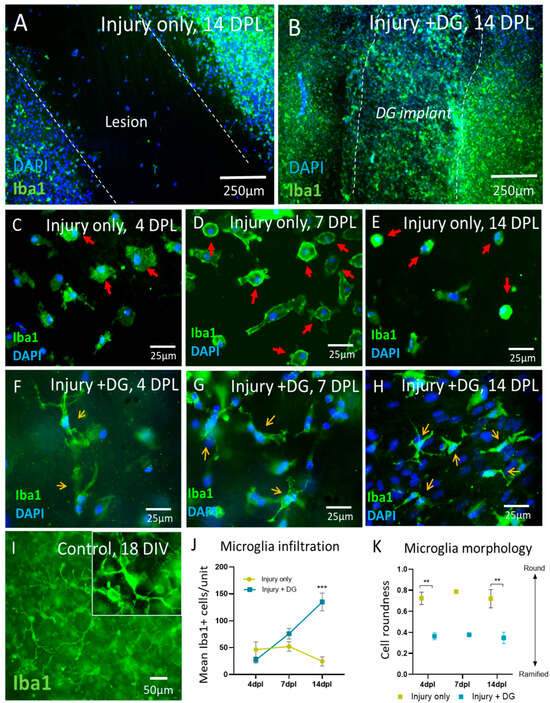 Assessment of the immune cell response is an important step in establishing an implanted material’s immunogenic profile. Iba1+ (a microglial cytoskeleton marker) stained a widespread population of microglia within the slices. At 14 DPL, Iba1 staining revealed a low number of microglia infiltrating the lesion site (Figure 4A). In contrast, a significantly higher number of microglia was observed infiltrating the lesion area when the DG implant was present (Figure 4B). An assessment of the morphologies of the material-residing microglia at 4, 7, and 14 DPL showed that they appear to resume a more ramified resting or transitional morphological phenotype compared to the reactive amoeboid or bushy microglia [15] in the injury-only lesion sites (Figure 4C–H). This ramified resting microglial morphology is observed throughout the control slices without injury (Figure 4I) and in injured bOSCs away from lesion sites (data not shown). Quantification of microglial infiltration across the three timepoints 4, 7, and 14 DPL showed an initial influx of microglia at 4 DPL in injury-only slices, which persisted until 7 DPL before beginning to decline in number (46.4 ± 14.2 and 52.2 ± 8.8, at 4 and 7 DPL, then dropping to 24.5 ± 8.4 at 14 DPL). In contrast, bOSC injuries with DG implantation exhibited a similar initial influx at 4 DPL; however, by the 7 and 14 DPL timepoints, microglial infiltration had continued to increase (Figure 4J, two-way ANOVA with Tukey’s multiple comparisons, n = 3, microglial numbers rising to 27.0 ± 5.6 at 4 DPL, 76.1 ± 10.0 at 7 DPL and 135.0 ± 16.3 at 14 DPL). Notably, while microglial infiltration was high, the microglia residing within the biomaterial had significantly greater numbers of ramified morphologies than cells within the lesion site alone at corresponding timepoints (microglial CRI in the injury-only group was 0.723 ± 0.034, 0.783 ± 0.011 and 0.720 ± 0.050 at 4, 7 and 14 DPL, respectively, while the CRI of microglia in the injury + DG were 0.361 ± 0.013, 0.376 ± 0.008, and 0.348 ± 0.031 at 4, 7 and 134 DPL respectively) (Figure 4K, two-way ANOVA with Tukey’s multiple comparisons, n = 3).
