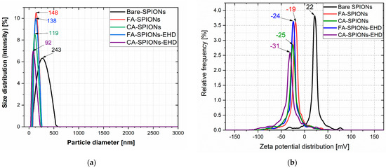 The hydrodynamic diameter refers to the size of a particle in the solution, including any surrounding hydration layer. The CA-modified iron oxide nanoparticles and the electrohydraulic discharge-processed CA-SPIONs had smaller hydrodynamic diameters of 119 nm and 92 nm, respectively, compared to FA-modified iron oxide nanoparticles and the electrohydraulic discharge-processed FA-SPIONs, with a hydrodynamic diameter of 148 nm and 138 nm, respectively (Figure 1a). However, all the modified particles were smaller than Bare-SPIONs, with a 243 nm particle diameter, likely due to the stabilization by the CA and FA molecules attached to the nanoparticle surface.