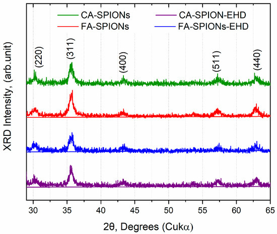 Diffraction patterns of the synthesized samples: CA-SPIONs, FA-SPIONs, CA-SPIONs-EHD, and FA-SPIONs-EHD.