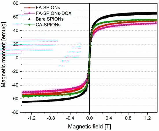 Vibrating sample magnetometry (VSM) is a technique used to measure the magnetic properties of materials. The magnetization curves of the synthesized magnetic nanofluids showed that bare, folic-acid-, and citric-acid-modified iron oxide nanoparticles were measured at room temperature under an applied field of 1.4 Tesla (see Figure 4). The saturation magnetization (Ms) values for bare SPIONs, CA-SPIONs, FA-SPIONs, and FA-SPIONs loaded with doxorubicin (FA-SPIONs-DOX) were determined to be 65.0, 55.8, 54.1, and 50.5 emu/g, respectively. This means that they are magnetic only when an external magnetic field is applied, and they lose their magnetism when the field is removed. This property is important for potential applications in targeted drug delivery, as the nanoparticles can be guided to the tumor site using an external magnetic field. The VSM results also demonstrate a progressive decrease in saturation magnetization with each successive modification, confirming successful surface modifications and drug loading while highlighting the impact of these changes on the magnetic properties of the nanoparticles.