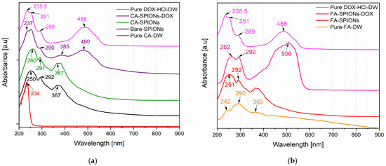UV-Vis spectroscopy is a technique used to identify and quantify the presence of specific molecules based on their absorption of light at different wavelengths. The UV-Vis absorption spectra of the DOX-loaded samples showed a characteristic absorption peak at around 480 nm, which is the absorption peak of doxorubicin. The absorption spectra for pure components and nanoparticle variants (bare SPIONs, CA-SPIONs, FA-SPIONs, and drug-loaded CA-SPIONs and FA-SPIONs) were analyzed. Doxorubicin’s main absorption peaks appeared at 235, 251, 289, and 488 nm (Figure 5a,b), consistent with reported data [29,30].