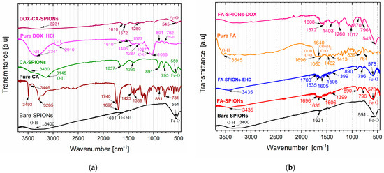 FTIR spectra of (a) bare SPIONs; pure citric acid (CA); CA-SPIONs; pure DOX; and DOX-CA-SPION. (b) bare SPIONs; pure folic acid (FA); DOX-FA-SPIONs; FA-SPIONs; and FA-SPIONs-EHD.