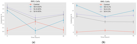 Effects of nanoparticles on RM1 cell line (MTT assay—cytotoxicity assessed at 570 nm), where control represents untreated tumor cells; (a) S0-0.02%—cells treated with 0.20 mg/mL concentrations of superparamagnetic iron oxide nanoparticles; S1-0.02%—cells treated with 0.20 mg/mL concentration of superparamagnetic iron oxide nanoparticles coated with citric acid; S2-0.02%—cells treated with 0.20 mg/mL concentration of electrohydraulic-processed superparamagnetic iron oxide nanoparticles coated with citric acid. (b) S0-0.1%—cells treated with 1.00 mg/mL concentrations of superparamagnetic iron oxide nanoparticles; S1-0.1%—cells treated with 1.00 mg/mL concentration of superparamagnetic iron oxide nanoparticles coated with citric acid; S2-0.2%—cells treated with 1.00 mg/mL concentration of electrohydraulic-processed superparamagnetic iron oxide nanoparticles coated with citric acid. p < 0.005.