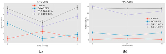 Effects of nanoparticles on RM 1 cell line (MTT assay—optical density assessed at 570 nm), where control represents untreated tumor cells; (a) DOX-0.02%—cells treated with doxorubicin at 0.37 mM concentrations; S3-1:10-0.02%—cells treated with 0.18 mg/mL concentrations of superparamagnetic iron oxide nanoparticles functionalized with doxorubicin and coated with citric acid; S4-1:10-0.02%—cells treated with 0.18 mg/mL concentrations of electrohydraulic-processed superparamagnetic iron oxide nanoparticles functionalized with doxorubicin and coated with citric acid. (b) DOX-0.1%—cells treated with doxorubicin at 1.84 mM, S3-1:1-0.1%—cells treated with 0.50 mg/mL concentrations of superparamagnetic iron oxide nanoparticles functionalized with doxorubicin and coated with citric acid; S4-1:1-0.1%—cells treated with 0.50 mg/mL concentrations of electrohydraulic-processed superparamagnetic iron oxide nanoparticles functionalized with doxorubicin and coated with citric acid. p < 0.005.
