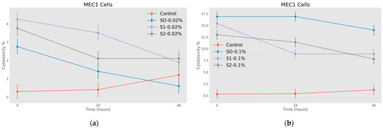 Effects of nanoparticles on MEC 1 cell line (MTT assay—cytotoxicity assessed at 570 nm), where control represents untreated tumor cells; (a) S0-0.02%—cells treated with 0.20 mg/mL concentrations of superparamagnetic iron oxide nanoparticles; S1-0.02%—cells treated with 0.20 mg/mL concentrations of superparamagnetic iron oxide nanoparticles coated with citric acid; S2-0.02%—cells treated with 0.20 mg/mL concentrations of electrohydraulic-processed superparamagnetic iron oxide nanoparticles coated with citric acid. (b) S0-0.1%—cells treated with 1.00 mg/mL concentrations of superparamagnetic iron oxide nanoparticles; S1-0.1%—cells treated with the 1.00 mg/mL concentrations of superparamagnetic iron oxide nanoparticles coated with citric acid; S2-0.1%—cells treated with—1.00 mg/mL concentrations of electrohydraulic-processed superparamagnetic iron oxide nanoparticles coated with citric acid. p < 0.005.