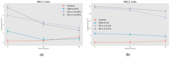 In the first stage of the research, the cytotoxic effect of nanoparticles coated with citric acid was determined. The obtained results emphasize the fact that the nanoparticles coated with citric acid have a certain cytotoxic effect on the MEC 1 cell line, and if they are added in the form where they are also loaded with the chemotherapy drug, it is assumed that this nanosystem will significantly increase the effectiveness of the test substance. The effect is also well timed and, in most cases, only fades slightly as time goes on. It is also worth noting the effectiveness of the drug coated with citric acid, which is detected immediately after treatment, but then the initial effect is overcome by tumor cells. The presented graph (Figure 9a,b) shows the cytotoxic effect of the nanosystems on tumor cells after the exposure at relatively high (1.00 mg/mL) and relatively low (0.20 mg/mL) concentrations.