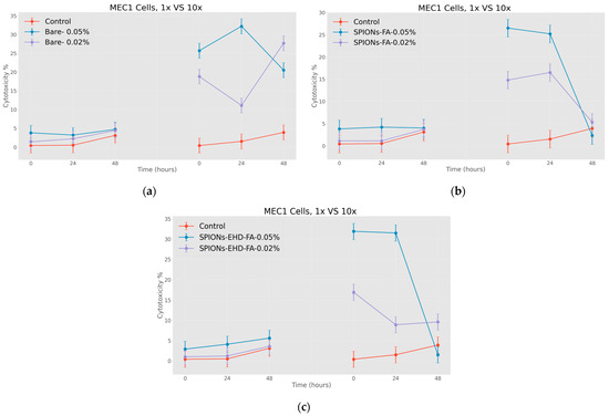 Effect of nanoparticles on tumor cells of MEC1 line, (MTT analysis—estimated optical density at 570 nm), where control represents untreated cells; (a) Bare—cells treated with solutions of 0.50 mg/mL and 0.20 mg/mL concentration of bare superparamagnetic iron oxide nanoparticles; (b) SPIONs-FA—cells treated with 1:10 concentration of 0.45 mg/mL and 0.18 mg/mL solutions of superparamagnetic iron oxide nanoparticles conjugated with folic acid; and, (c) SPIONs-EHD-FA—cells treated with 0.50 mg/mL and 0.20 mg/mL concentration of electrohydraulic-processed superparamagnetic iron oxide nanoparticles solutions conjugated with folic acid at 1:10 concentration. p < 0.005.