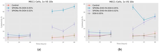 Effect of nanoparticles on tumor cells of MEC1 line (MTT analysis—estimated optical density at 570 nm), where control represents untreated cells; (a) SPIONs-FA-DOX—cells treated with 1:10 concentration of 0.45 mg/mL and 0.18 mg/mL solutions of superparamagnetic iron oxide nanoparticles loaded with doxorubicin and conjugated with folic acid; and (b) SPIONs-EHD-FA-DOX—cells treated with 1:10 concentration of 0.45 mg/mL and 0.18 mg/mL solutions of electrohydraulic-processed, folic-acid-conjugated and doxorubicin-loaded superparamagnetic iron oxide nanoparticles; DOX—cells treated with 1:10 concentration of 0.45 mg/mL solution of doxorubicin. p < 0.005.
