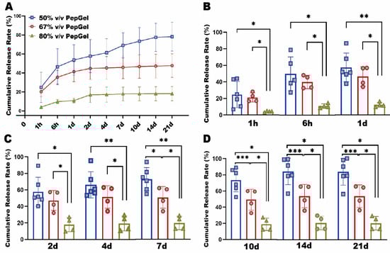 (A) In vitro rhBMP-2 cumulative release kinetics from three different formulations of PepGel. (B) Comparison of rhBMP-2 cumulative release rates among the three groups at 1 h, 6 h, 1 d. (C) Comparison of rhBMP-2 cumulative release rates among the three groups at 2 d, 4 d, 7 d. (D) Comparison of rhBMP-2 cumulative release rate among three groups at 10 d, 14 d, 21 d. *, **, and *** indicate significant differences with p < 0.05, p < 0.01, and p < 0.001, respectively. h = hour, d = day.