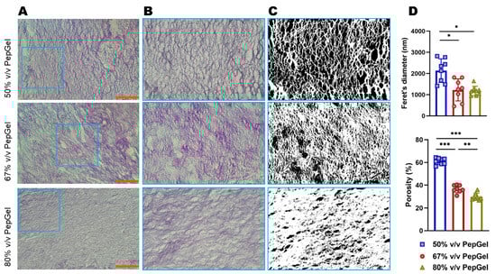 (A) Microscopic images (×100) of PGmatrix 3D shape nanoweb network. (B) Microscopic images (×400) magnified from the box in (A). (C) Microscopic images (×400) processed by ImageJ. (D) ImageJ analysis of the pore size of the three PepGel groups. Hematoxylin and Eosin Staining; scale bar = 100 µm; *, **, and *** indicate significant differences with p < 0.05, p < 0.01, and p < 0.001, respectively.