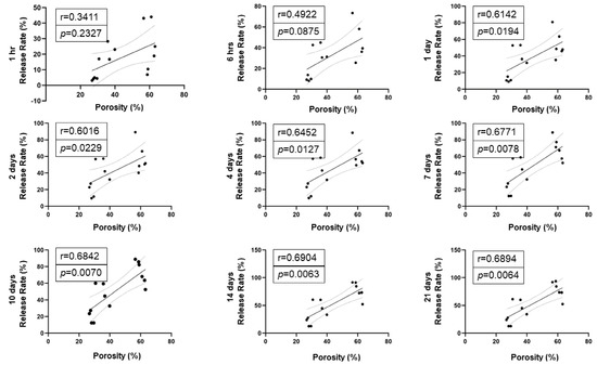 Correlation analyses of gel porosity and cumulative rhBMP-2 release rate at each timepoint. Note: higher gel porosities were significantly correlated with higher rhBMP-2 release rates from day 1 to day 21.