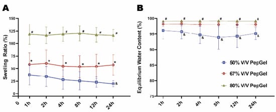 (A) Comparison of the swelling ratio among three groups. (B) Comparison of the equilibrium water content (EWC) among three groups. h = hour, n = 6 per PepGel formulation/timepoint. # p < 0.05, 80% v/v PepGel compared to 50% v/v PepGel; * p < 0.05, 80% v/v PepGel compared to 67% v/v PepGel; & p < 0.05, 50% v/v PepGel compared to 67% v/v PepGel.