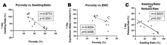 (A) Correlation analysis of PepGel porosity and swelling ratio. (B) Correlation analysis of PepGel porosity and equilibrium water content (EWC). (C) Correlation between PepGel-swelling ratio and rhBMP-2 release rate, indicating that PepGel-swelling ratio was negatively correlated with rhBMP-2 release rate.