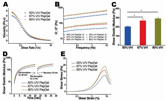 The rheological properties of PepGel (PGmatrix 3D shape) were measured under shear mode on a Kinexus lab + rheometer (Netzsch Instruments North America LLC, Burlington, MA, USA) with a 20 mm diameter parallel plate geometry and a 500 mm gap size. PepGels with the concentrations of 50, 67, and 80 v/v % were prepared as previously described.