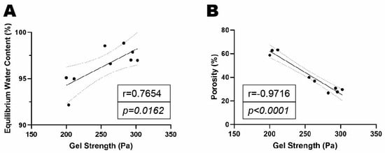 (A) Correlation analysis of gel strength and equilibrium water content (EWC). (B) Correlation analysis of gel strength and gel porosity.