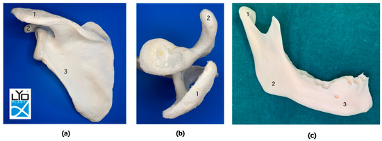 Lyophilized left scapula (a,b) bioimplant Lyoplast® ((a)—posterior view, (b)—lateral view: 1—scapular acromion process (SAP); 2—scapular coracoid process (SCP); 3—scapular lateral border (SLB)) and right hemimandible (c) bioimplant Lyoplast®: 1—mandibular condyle (MC); 2—mandibular angle (MA); 3—mental protuberance (MP).