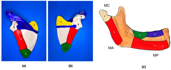 Anatomical mapping of the human scapula ((a)—posterior view; (b)—anterior view; 1—superior angle, 2—inferior angle, 3—lateral border, 4—coracoid process, 5—acromion, 6—glenoid) and the human mandible (c) with respective color-coded recipient zones: mandibular condyle (MC); mandibular angle (MA); mental protuberance (MP).