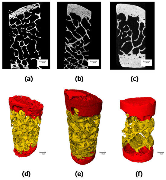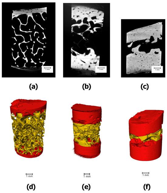 Mandibular bone samples’ image acquisition, volume rendering, and segmentation ((a,d)—SCP; (b,e)—SAP; (c,f)—SLB)).