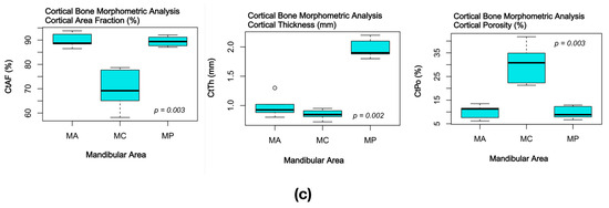 Comparative analysis of the trabecular and cortical bone morphometric parameters of the experimental mandibular bone samples: (a) trabecular bone volumetric parameters; (b) trabecular bone connectivity parameters; (c) cortical bone parameters.