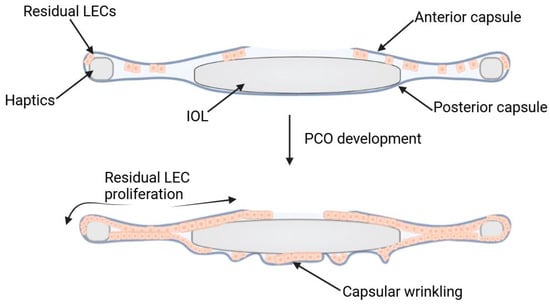 Capsular biocompatibility is determined by the interaction between the IOL and the remaining LECs in the capsular bag. The most common postoperative complication of cataract surgery, known as posterior capsule opacification (PCO), is caused by the remaining LECs proliferating, migrating, and differentiating into fibroblast-like cells on the surface of the IOL [9,11].
