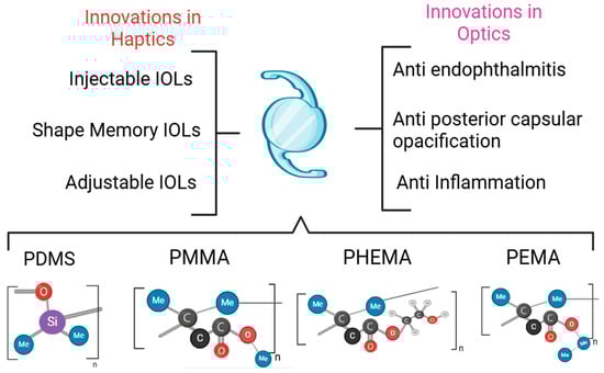 - Čanović, S.; Konjevoda, S.; Pavičić, A.D.; Stanić, R.; Čanović, S.; Konjevoda, S.; Pavičić, A.D.; Stanić, R. Intraocular Lens (IOL) Materials. In Intraocular Lens; IntechOpen: London, UK, 2019; ISBN 978-1-83880-485-5. [Google Scholar]