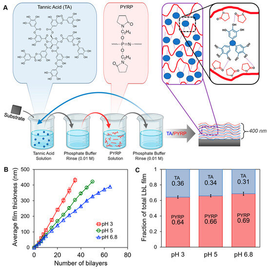 (A) Graphic representation of PYRP/TA LbL assembly and hydrogen bonding between the pyrrolidone groups in PYRP and gallol groups in TA. The LbL schematic shows the sequential dipping of a substrate into TA solution, rinse solutions, PYRP solution, and rinse solutions to form one bilayer. This sequence is repeated until our desired thickness, 400 nm, is reached. (B) LbL growth curve of PYRP/TA at pH 3, 5, and 6.8, as determined by spectroscopic ellipsometry. (C) Fraction of TA and PYRP within the PYRP/TA LbL films assembled at pH 3, 5, and 6.8.