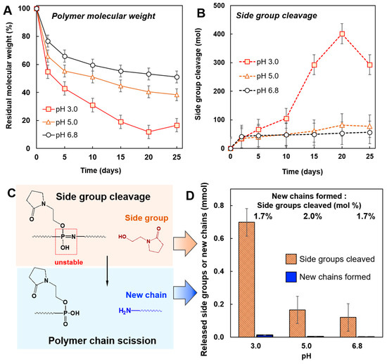 The loss in the molecular weight of the polymer was most pronounced at pH 3.0—approximately 80% over the 25-day period—with the rate of degradation slowing down as the pH of solution increases, i.e., 60% loss at pH 5.0 and 50% loss at pH 6.8 (Figure 2A and Supplementary Materials, Figure S2). Independent measurements of hydrodynamic diameter of PYRP by DLS (Supplementary Materials, Figure S3) and its molecular weight by AF4 (Supplementary Materials, Figure S4) were in line with the SEC findings. Such pH dependence agrees with the previously reported acid-catalyzed mechanism of polyphosphazene degradation in aqueous solutions [53,54]. The total amount of the side group (N-(2-hydroxyethyl)-2-pyrrolidone) cleaved over the 25-day degradation experiment was near 300 molecules per polymer chain at pH 3.0 vs. approximately 80 or 60 molecules at pH 5.0 and 6.8, respectively (Figure 2B). Figure 2C shows the schematics of the hydrolytic pathway, in which cleavage of the side group and the formation of the phosphazane functionality is followed by the polymer backbone scission. Comparison of the amount of side groups cleaved with the number of new chains formed as the result chain scission at 25 days reveals that only 1.7–2% of the side group cleavages result in the breakdown of the polymer chain (Figure 2D).