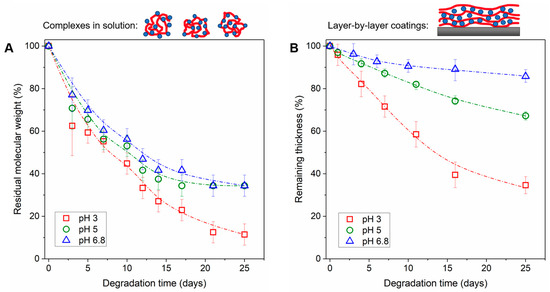 Degradation of (A) PYRP/TA complexes (1:20 TA:PYRP mass ratio) and (B) 400 nm PYRP/TA LbL films (1:2 TA:PYRP mass ratio, as seen in Figure 1C) upon exposure to 0.01 M phosphate buffer at a matched pH of assembly (i.e., pH 3, pH 5, or pH 6.8) and 50 C. Complexes were monitored via AF4, and LbL films via spectroscopic ellipsometry.