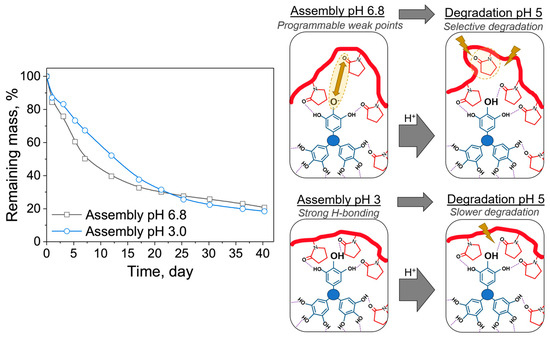 To investigate the effect of assembly pH on film degradation at a fixed pH, we assembled LbL films at pH 3 and pH 6.8 and put them into pH 5 solution for degradation. Measurements were collected after the first 30 min to allow the film to adapt to the initial pH mismatch. As shown in Figure 5, the films assembled at pH 6.8 initially degraded faster than the films assembled at pH 3. This effect also was confirmed via spectroscopic ellipsometry (Supplementary Materials, Figure S14). We hypothesize that this difference in the initial degradation rate is due to programmable ‘defects’ in the interlayer interactions stemming from the initial assembly conditions. As mentioned earlier, TA has ~2% charge near neutral pH, yet those few charges can cause significant electrostatic repulsion within the densely packed multilayers and can potentially create a more hydrated microenvironment for film degradation. Thus, these ‘defects’ are likely to be more hydrolytically labile than the groups stabilized by hydrogen bonds, leading to rapid initial degradation, as shown in the schematic in Figure 5. Slight differences between the rate observed with QCM versus ellipsometry probably resulted from substrate effects, as the film was deposited on a gold-coated quartz crystal for QCM measurements and on a silicon wafer for ellipsometric measurements.