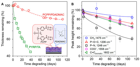 The structural diversity of polyphosphazenes is mainly attributed to the macromolecular substitution synthetic route. To investigate the effect of side group on the rate of degradation, we assembled an anionic polyphosphazene with alkoxybenzoic acid side groups, poly[di(carboxylatophenoxy)phosphazene (PCPP), with strong polycation poly(diallyl dimethylammonium chloride) (PDADMAC) and monitored the degradation over 110 days. PCPP is a water-soluble polymer with reported applications in vaccine delivery and microencapsulation [56,57,58]. PCPP shows higher resistance to degradation in solution than other polyphosphazenes with more hydrophilic side groups, such as PYRP [53]. When assembled at pH 6.8 and degraded at pH 5, the PCPP/PDADMAC system degraded at a rate of ~0.15% film thickness per day, in comparison to PYRP/TA degradation at ~1.5% per day (Figure 6A). This tenfold decrease in degradation rate is because of the side group chemistry/hydrophobicity and demonstrates the wide range of degradation rates that can be reached by various combination of polyphosphazenes and binding partners. Additionally, the PCPP/PDADMAC system also showed a preferential cleavage of the phosphazene bond and high retention of the hydroxybenzoic acid side group (Figure 6B), similar to the PYRP/TA LbL system. However, unlike the rapidly degrading PYRP/TA LbL systems, the effect of assembly pH on the degradation rate was negligible in the 110-day period (Supplementary Materials, Figure S15).
