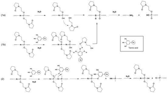 Potential pathways for the solution and solid-state degradation of PYRP in the absence (1a) and presence of TA (1b,2). Scheme (1a) occurs in solution, while Scheme (1b,2) likely occur in the LbL films.