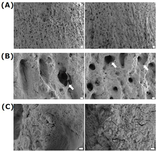 Exemplary images of deer antlers: (A) overview, (B) with their specific microstructures, and (C) with their nanostructures within the microstructures. Note that ~26 micro-cavities (arrows) per mm2 (26.2 ± 1.9) could be observed with a dimension of 41.9 ± 2.4 µm, mean ± s.e.m. (FE-SEM Merlin VP compact, 5 kV, HE-SE detector; scale bars: (A) = 100 µm, (B) = 20 µm, (C) = 2 µm)).