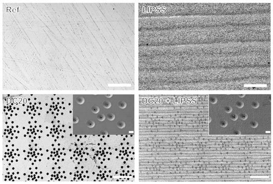 Figure 2 shows microscopic observations of the steel surfaces after polishing (Ref), those with nanostructured LIPSS, micro-dimple cluster DC20 featuring a dimple diameter of 20 µm at a density of 80 dimples per cluster, and the combination of micro-dimples and nanostructured DC20 + LIPSS. A similar characterization of the nano- and microstructures could also be achieved for titanium alloy. Details and images of all investigated laser-induced nano- and microstructures can be viewed in Appendix A.