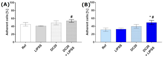 Initial adhesion of keratinocytes (HaCaT) on laser-structured specimens after 10 min: (A) on medical steel and (B) titanium alloy (Ti6Al4V). Note that the attachment of HaCaTs is significantly increased solely on the laser-induced micro-dimple cluster with additional nanostructures (DC20 + LIPSS) for both materials (FACSCalibur; n = 4 independent experiments, mean ± s.e.m., ordinary one-way ANOVA posthoc uncorrected Fisher’s LSD: * p ≤ 0.05 to Ref, # p ≤ 0.05 to LIPSS).