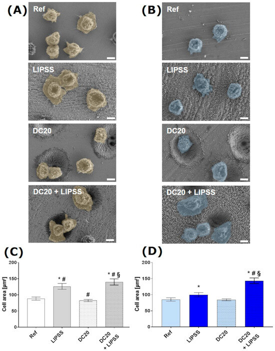 Cell spreading and growth of human keratinocytes (HaCaT) after 2 h on laser-structured metal specimens: (A) on medical steel and (B) on titanium alloy (Ti6Al4V). (FE-SEM Merlin VP compact, 2000× magnification, 5 kV, HE-SE detector, scale bars = 5 µm). The cell area of HaCaTs on (C) steel and (D) on Ti6Al4V. Note that the spreading of cells on both metals with micro-dimple clusters and additional nanostructures (DC20 + LIPSS) is significantly increased compared to all other specimens. Also, cells on the laser-induced periodic surface structures (LIPSS) shown on both materials achieved an enhanced cell area compared to polished metals (Ref). (ImageJ; n = 40 cells of SEM images, mean ± s.e.m., Kruskal–Wallis test post-tested with adjusted Mann–Whitney test: * p ≤ 0.05 to Ref, # p ≤ 0.05 to LIPSS, § p ≤ 0.05 to DC20).