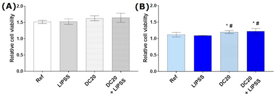 Relative cell viability of keratinocytes (HaCaT) on the different specimens after 24 h: (A) on steel and (B) on titanium alloy (Ti6Al4V). Cell metabolism (MTS assay) values were related to cell density (crystal violet). (Anthos reader; n = 4, mean ± s.e.m., Kruskal–Wallis test post-tested with adjusted Mann–Whitney test: * p ≤ 0.05 to Ref, # p ≤ 0.05 to LIPSS).