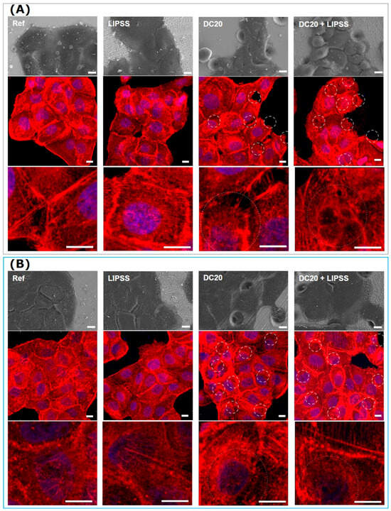 Cell morphology and actin cytoskeleton organization of human keratinocytes (HaCaT) after 24 h on different laser-structured metal specimens: (A) medical steel and (B) Ti6Al4V. Note that the cells grew on both metals and were independent of the structuring process. After 24 h, there was no apparent change in cell morphology and actin cytoskeleton. HaCaTs could span over the micro-dimple clusters and their actin filaments. (First row: FE-SEM Merlin VP compact, 1000× magnification, 5 kV, HE-SE detector. Second and third rows: LSM780, 63× oil objective, both Carl Zeiss; actin in red, nucleus in blue, underlying micro-dimples are marked as dotted circles, scale bars = 10 µm).